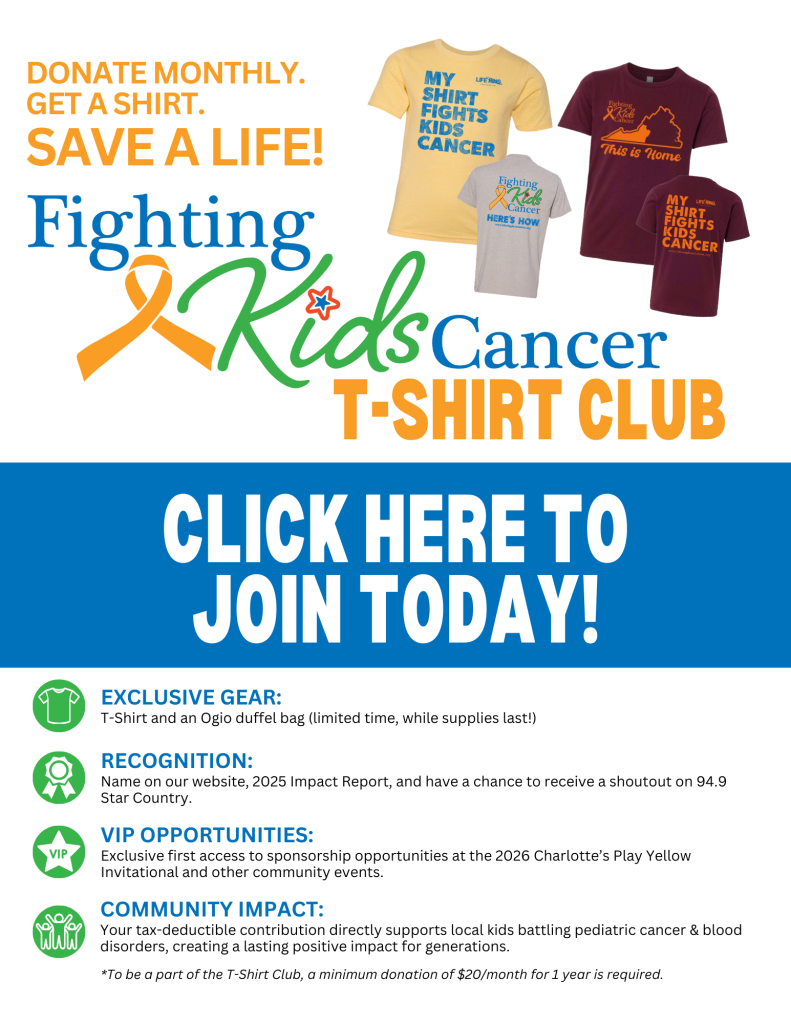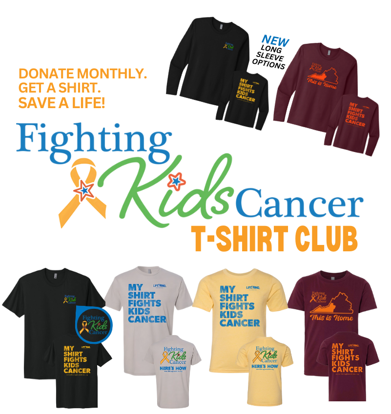 Join the Fighting Kids Cancer T-Shirt Club by simply making a monthly commitment of $20 (or more) per month for one year! By joining the club, you join the fight in helping our children in SWVA receive the treatment they need.