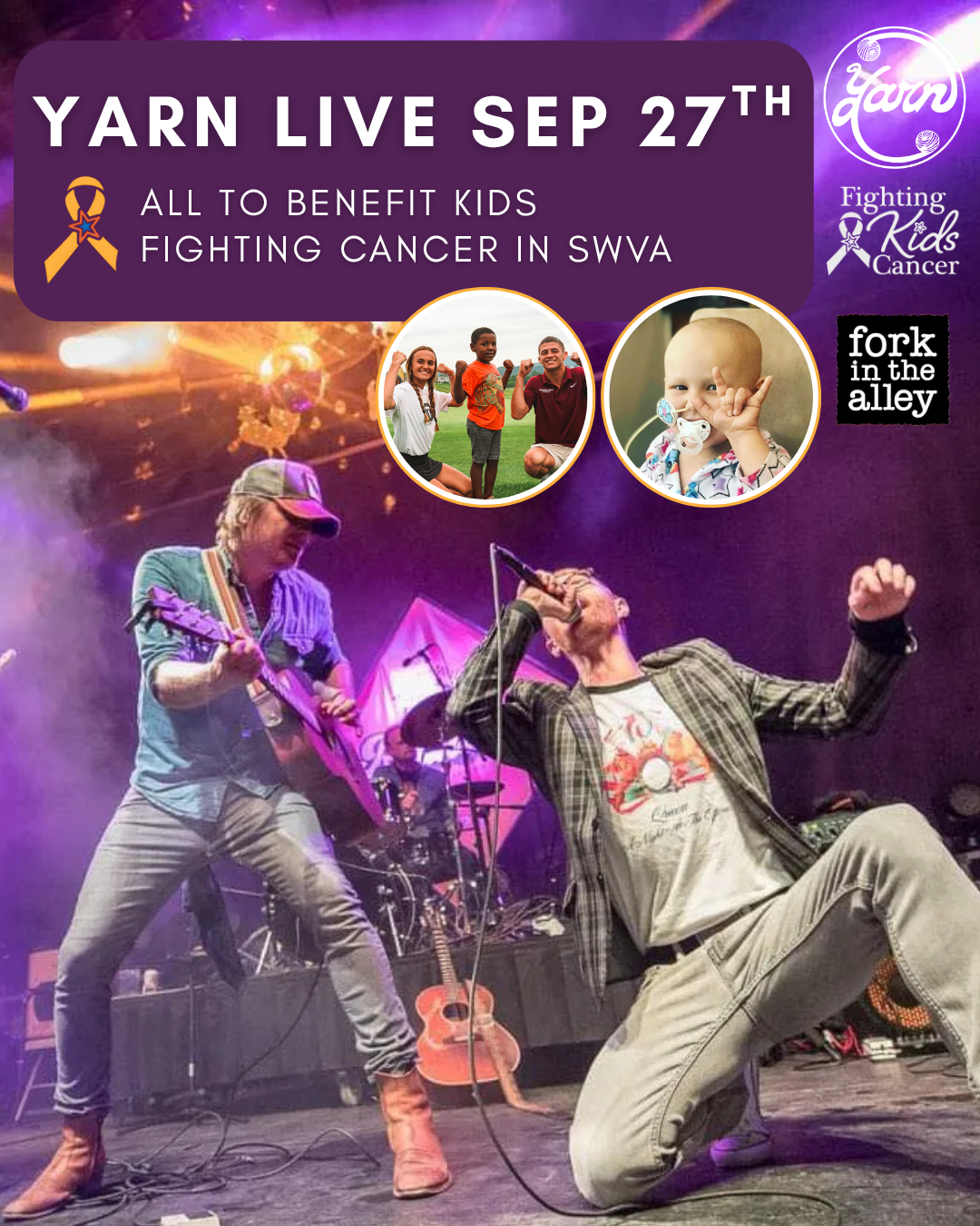 YARN YARN, an americana group from North Carolina performed at the inaugural Charlotte’s Play Yellow Celebrity Invitational in 2023 and was the main entertainment for a fundraising concert at Fork in the Alley in 2025. Donate Monthly, Get a Shirt, Save a Life! Learn more